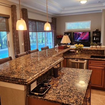 Florida home for sale featuring a gourmet kitchen with a 12-foot granite bar, stainless steel appliances, and plenty of space for entertaining. The open-concept design connects the family room, living room, dining area, and primary suite—all overlooking the sparkling pool and serene preserve views. Elegant architectural details include tray ceilings, crown molding, arches, and columns. The luxurious primary suite offers a spa-like bath and a custom walk-in closet system. Recently renovated bathrooms feature quartz countertops and modern showers. Enjoy durable flooring throughout—tile, engineered hardwood, and carpet—for both style and comfort. The 3-car garage with golf cart door boasts new polyaspartic hard surface flooring, while a new 50-gallon water heater adds peace of mind.